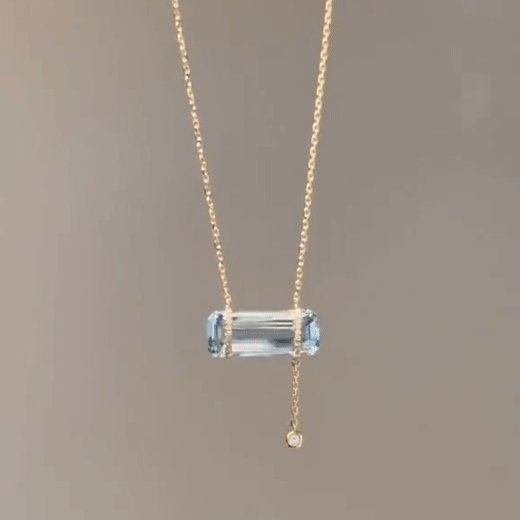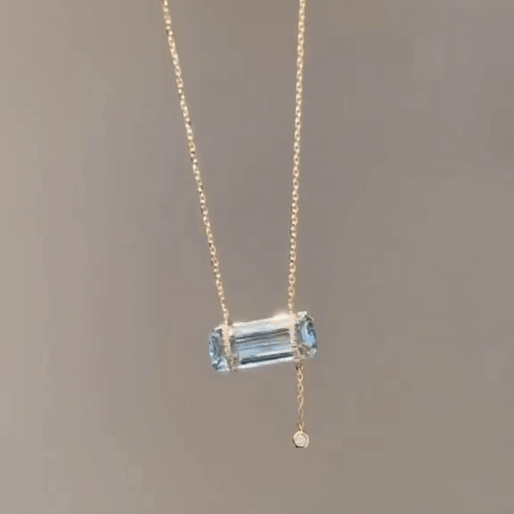Det pryds av en strålande baguetteslipad Aqua Aura-kristall, en ädelsten känd för sitt eteriska blå skimmer och sina kraftfulla andliga egenskaper.