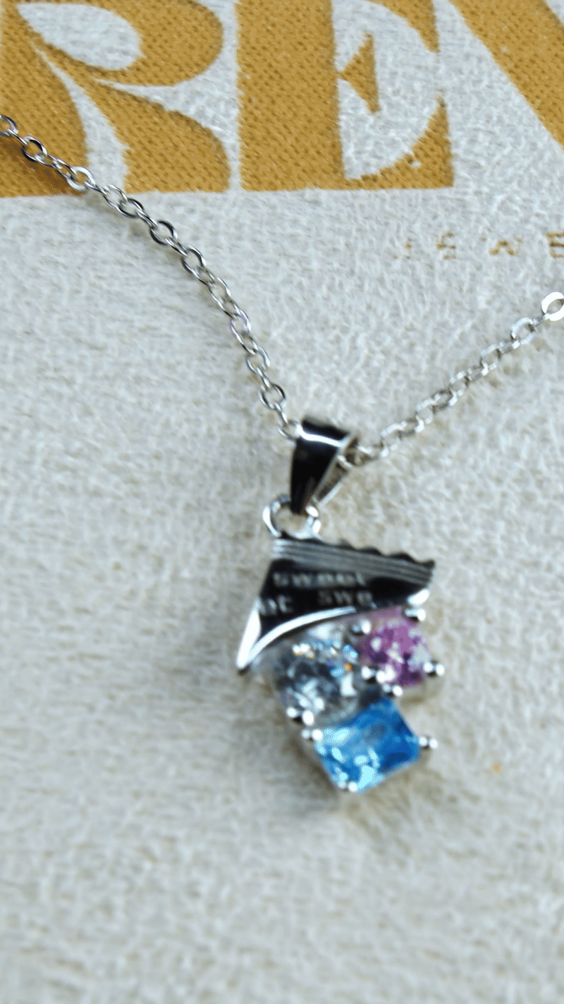 Tillverkat i massivt 925 sterlingsilver, fångar detta lekfulla hänge glädjen av en söt godbit med en överraskande twist: tre bländande kristaller i pastellnyanser, himmelsblått, rodnande rosa och klar briljans, inbäddade under ett skulpterat silveromslag graverat med sötsaker.